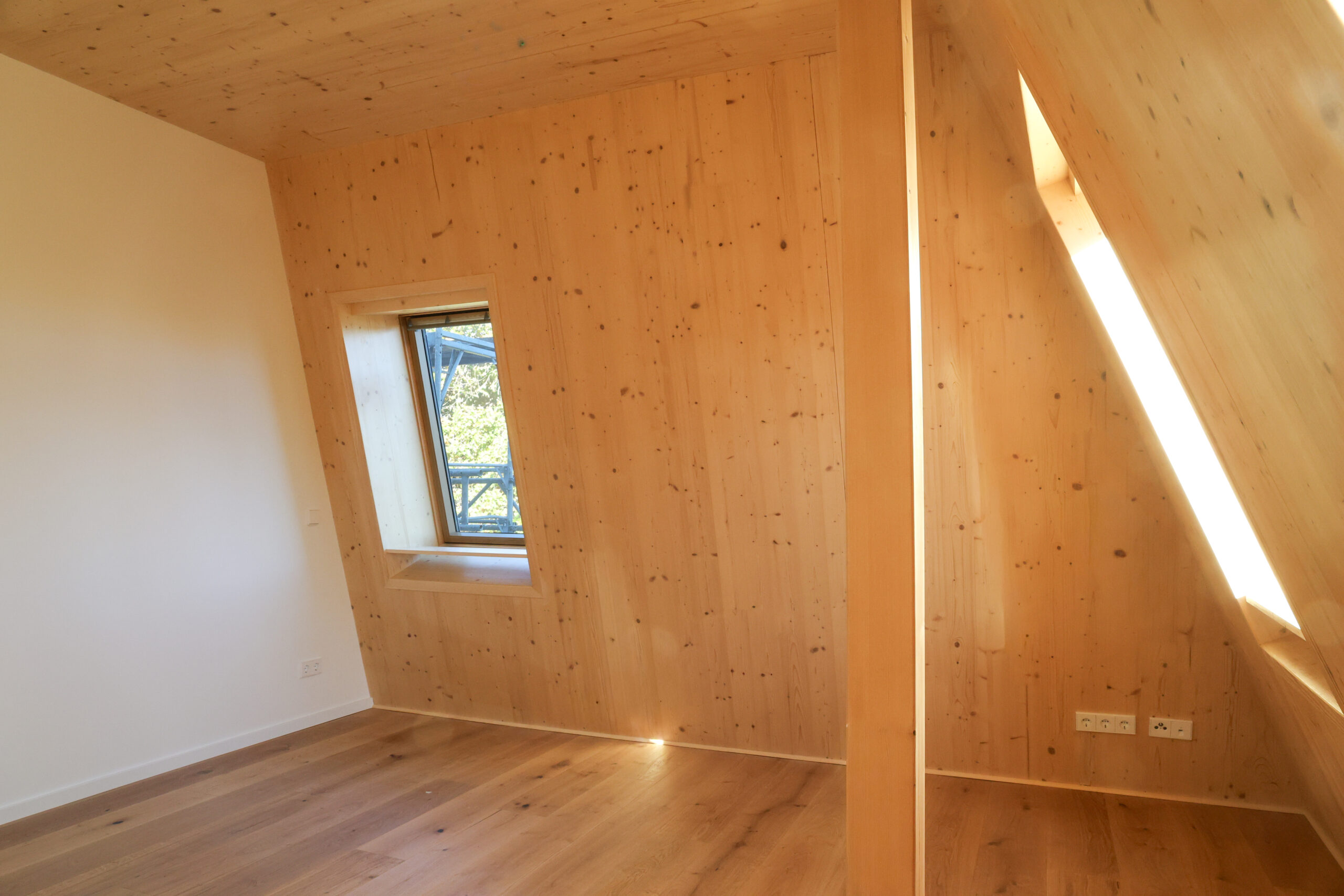 Die Brettsperrholzelemente sind größtenteils von innen sichtbar, während die Holzverschalung von außen repräsentativ für das Gebäude ist. Die Materialität trägt zur Verstärkung des Konzepts bei. Die Wärmeversorgung erfolgt durch Umweltwärme mittels einer Wärmepumpe. Auf dem Gründach ist zudem eine PV-Anlage installiert. Das Regenwasser wird in einer Zisterne auf dem Grundstück gesammelt und zur Gartenbewässerung verwendet.