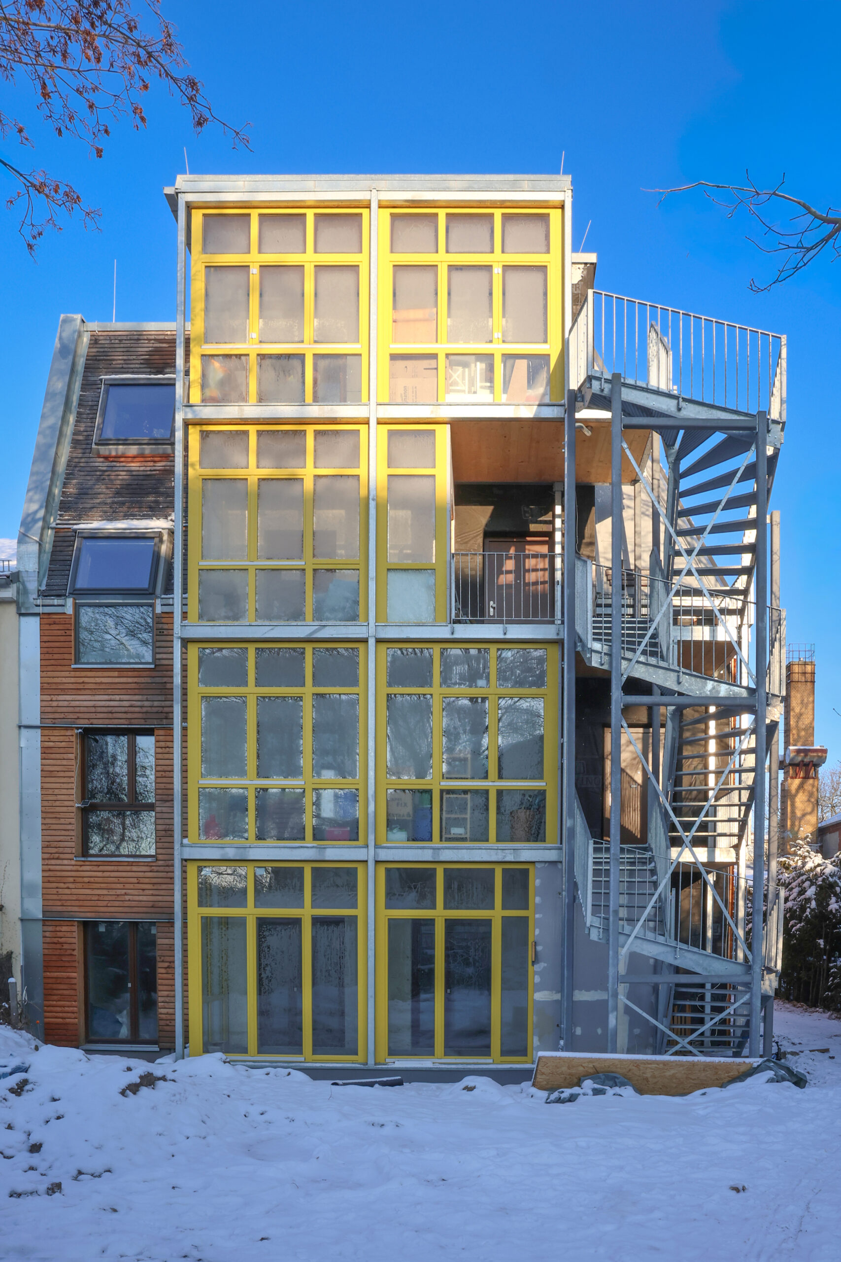 The site was developed with a three-story building facing the street, including an additional unit in the roof, and a garden house situated within a large shared garden. On the ground floor, subsidised and accessible apartments are accessed from the street via front gardens. The other, dual aspect apartments have additional living space through projecting winter gardens that extend into the garden. An external steel staircase provides access to the upper floors and helped reduce overall construction costs.