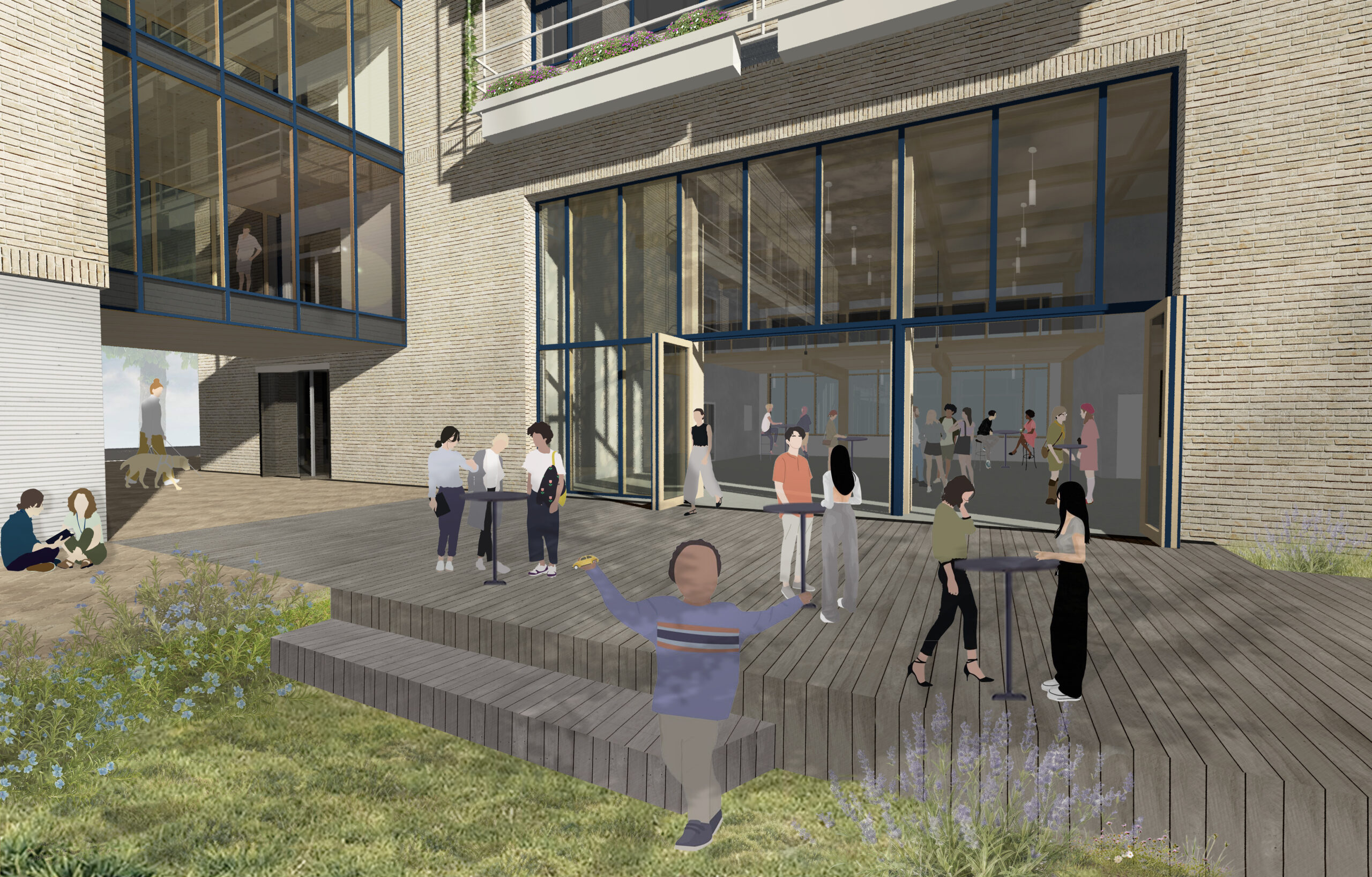 Konstruktiv steht das Gebäude mit ca. 3.500m² BGF für einen verantwortungsvollen Umgang mit Ressourcen: Als Holzskelettbau mit zwei aussteifenden Treppenhauskernen konzipiert, ist es als „KfW-Nachhaltiger Neubau“ geplant und erreicht den Standard eines Effizienzhauses 40. Wärme und Kälte werden über Luft/Wasser-Wärmepumpen bereitgestellt, während eine vorgesetzte Fassadenbegrünung als natürlicher Sonnenschutz dient. Das anfallende Regenwasser wird über das Gründach gespeichert, bzw. verdunstet und trägt so zu einem verbesserten Stadtklima bei. Über eine PV-Anlage wird das Ensemble mit erneuerbarem Strom versorgt. Eine Lebenszyklusanalyse begleitet den gesamten Planungsprozess und optimiert die ökologische Bilanz der Konstruktion kontinuierlich.